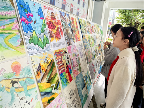 展覽期間,不少家長通過學(xué)校推送的電子畫冊(cè)等方式欣賞到學(xué)生作品。一位家長在反饋中談到:“孩子為了繪制《祖國啊,我親愛的祖國》,不僅反復(fù)研讀詩句,還主動(dòng)查閱詩人舒婷的創(chuàng)作背景。這樣的學(xué)習(xí)方式,比單純背誦更能激發(fā)對(duì)文本的理解與共鳴?!?/p>
